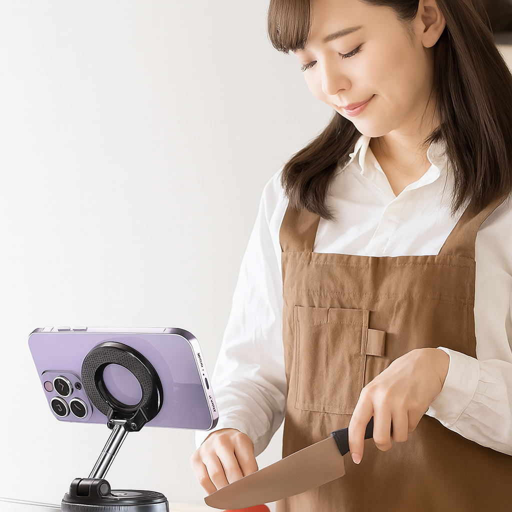 Bază rotativă la 360°, brațe metalice pliabile cu unghi reglabil de până la 210°. Comutați instantaneu între modul portret și peisaj, oriunde aveți nevoie.
