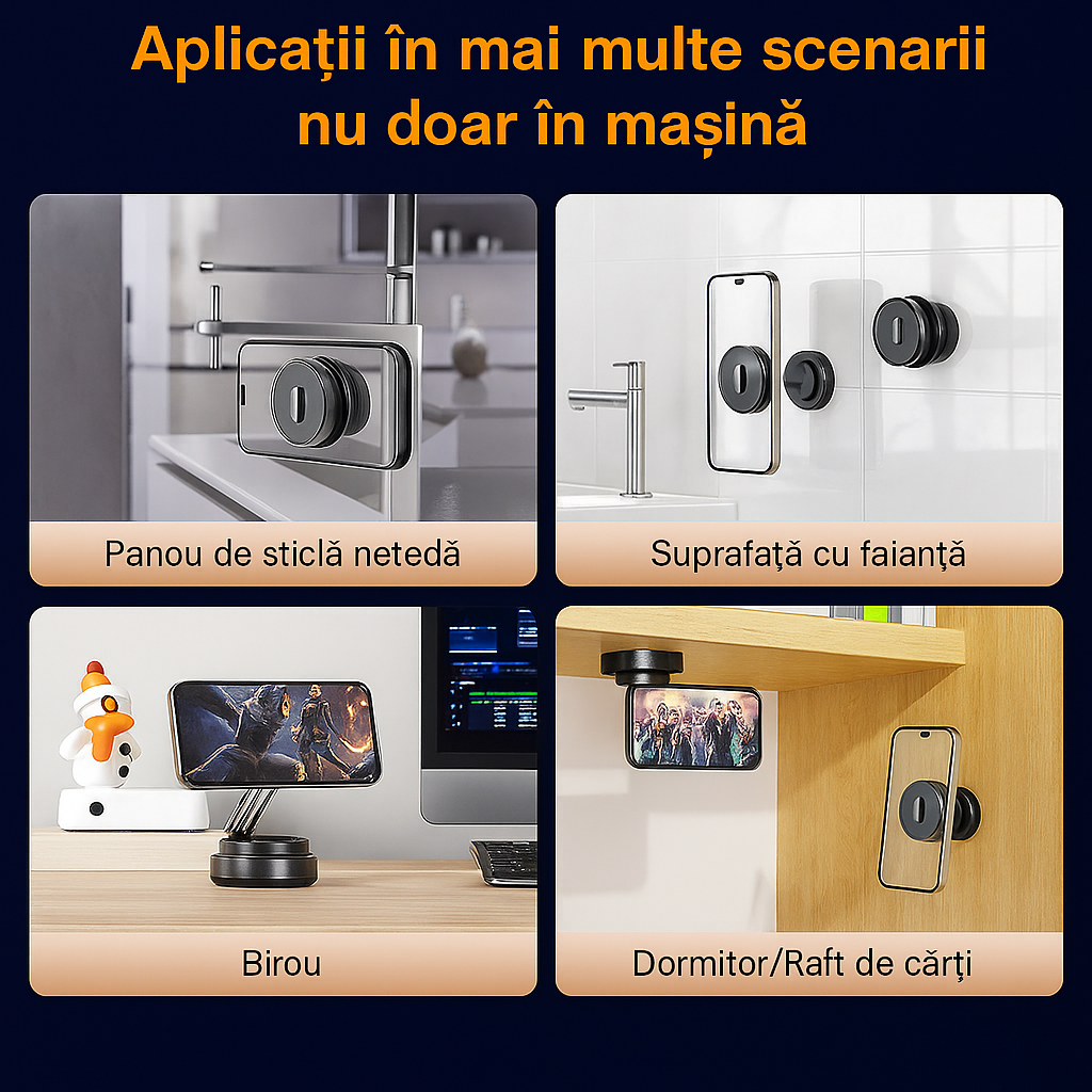 Funcționează perfect direct cu iPhone 12/13/14/15/16 sau cu orice alt telefon prin intermediul inelului magnetic inclus. Ai libertate totală de a-l monta oriunde dorești - pe bordul mașinii, pe birou, pe perete, pe blat sau pe sticlă.