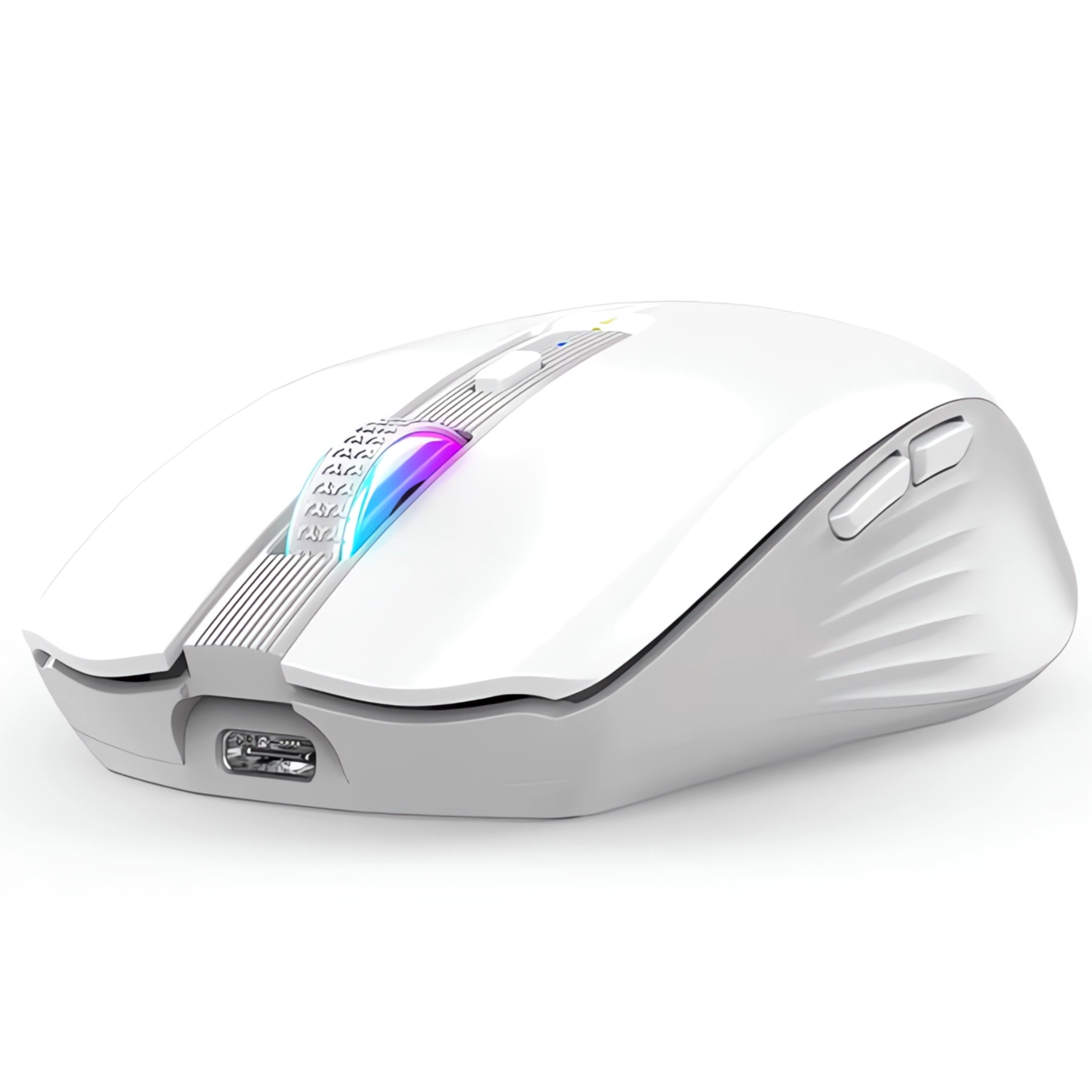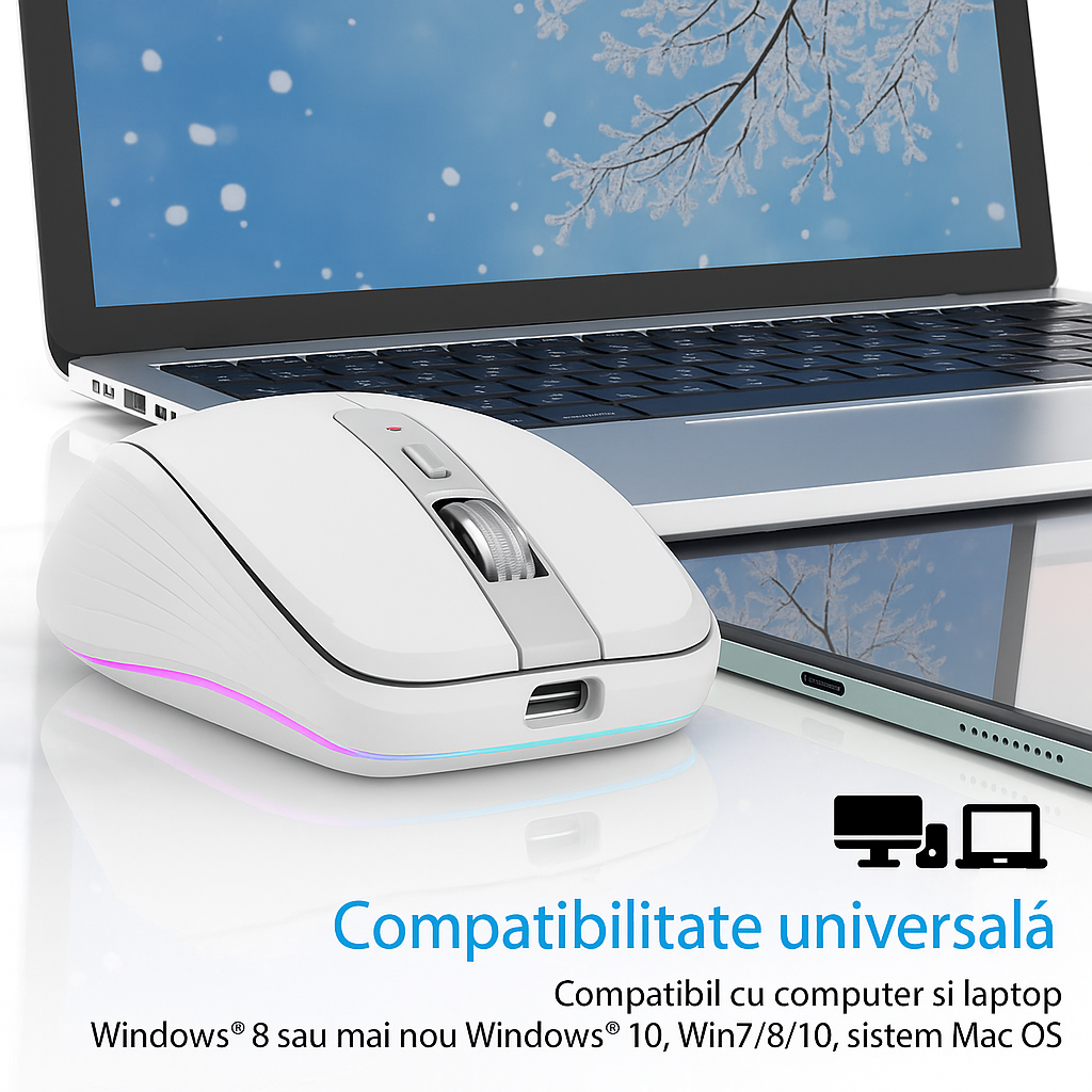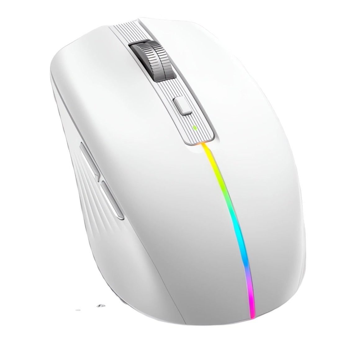 Mouse wireless Bervolo® Nexus Pro, conectivitate simultană la 3 dispozitive, DPI reglabil, iluminare RGB, reîncărcabil USB tip C, clic silențios, ergonomic, alb