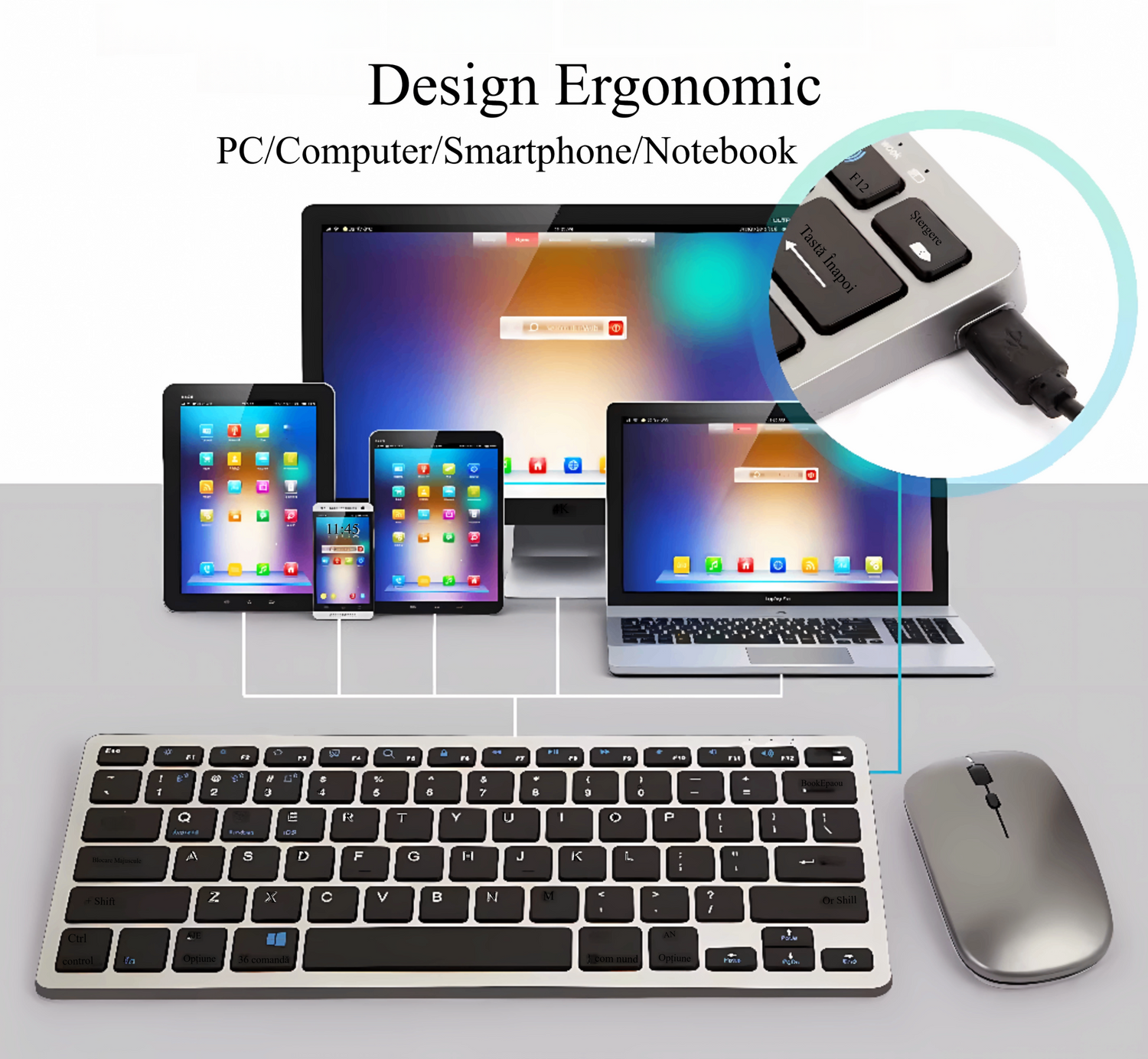Set tastatură și mouse wireless Bervolo® Essential Slim, conectivitate triplă, reîncărcabilă Type-C, Bluetooth și USB, ultra-subțire, compatibil cu Windows/Mac/Android/iOS, 78 de taste silențioase, gri antracit