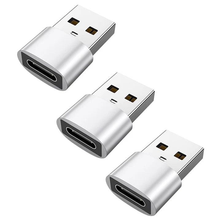 Set de 3 adaptoare Bervolo® OTG USB-A la USB C, încărcare rapidă 3A, transfer rapid de date, carcasă din aluminiu, compacte, argintii