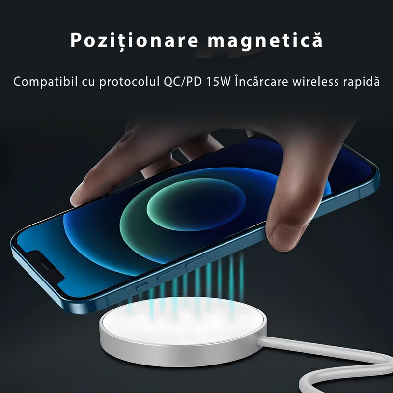 - Folosește încărcătorul direct pe telefon sau cu husa specială MagSafe pentru aliniere perfectă.