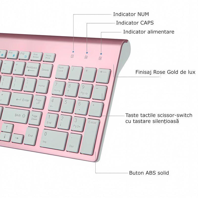 Set Universal Combo Tastatură și Mouse Premium Bervolo®, Wireless 2.4G, Click Scissor Switch, Versiune US, Rose Gold